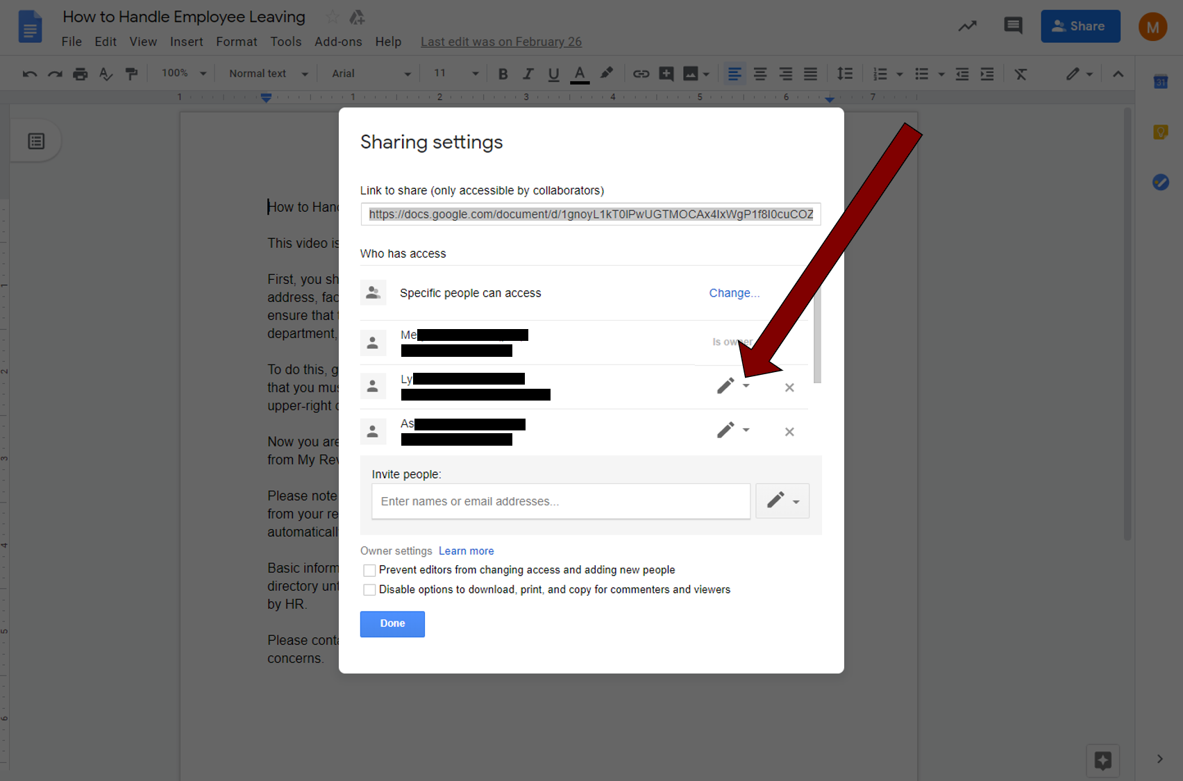 - The names and email addresses of those who have access to your file will be listed. To check and change an individual's level of access, select the drop-down menu next to their name. The drop-down menu is one of: a pencil icon, a text box icon, or an eye icon.