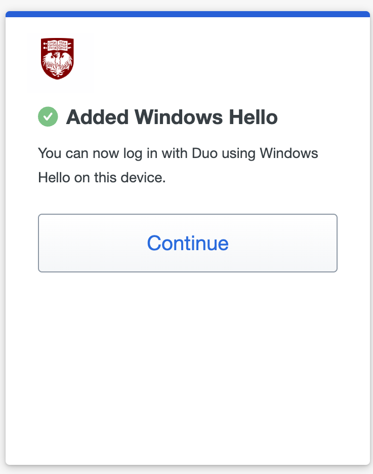 7. When you receive confirmation that you added Windows Hello as a verification method, select Continue.