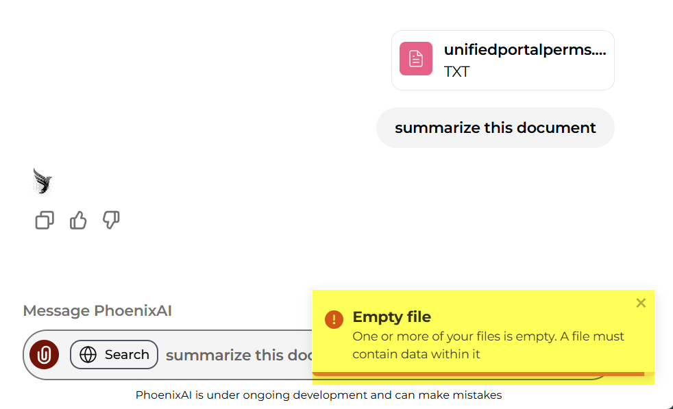 When uploading .txt files to PhoenixAI, users may encounter an "empty file" error if the file contains special characters. PhoenixAI currently only supports files made up of plain alphanumeric characters — that is, letters A–Z, a–z, and numbers 0–9. Any characters outside this range (including punctuation, symbols, bullet points, spaces, and control characters) may cause the system to reject the file or return it as empty.