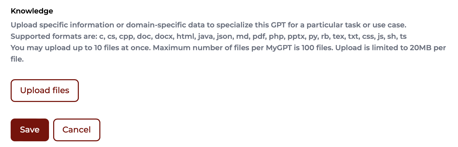 - Knowledge: Click Upload files to upload Knowledge files. No more than 100 files can be uploaded to an individual Assistant. Each upload is limited to 20MB per file. Supported file formats are: c, cs, cpp, css, doc, docx, html, java, js, json, md, pdf, php, pptx, py, rb, sh, tex, ts, txt.